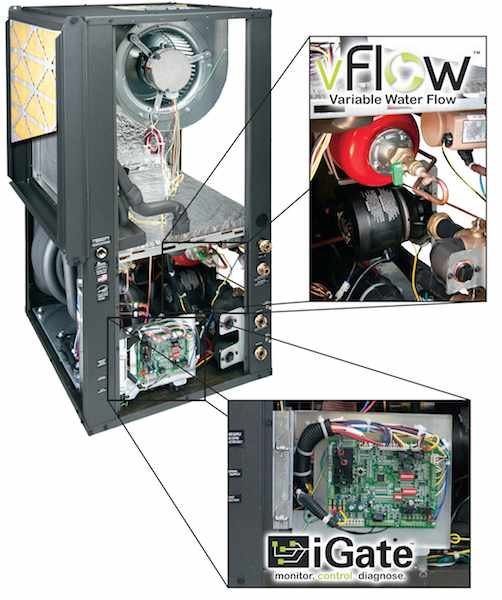 ClimateMaster’s iGate and vFlow technologies are part of its Tranquility 22 Two-Stage Compact, Tranquility 22 Digital, Tranquility 30 Digital, and Tranquility Vertical Stack Series of units for both residential and commercial applications. The proprietary iGate control system offers HVAC system optimization by employing two-way communication that enables end-users and contractors to monitor heat pump unit performance, custom-tailor its operation, and diagnose any issues directly from the thermostat. vFlow variable water flow technology integrates all major water circulation components directly into the heat pump unit, while also intelligently varying water flow to minimize the pump’s energy consumption and improve overall system reliability. In addition, vFlow protects the unit against extreme operating conditions, extending the life of the compressor and air coil. As vFlow is internal to the unit, it also makes for a streamlined, compact installation.