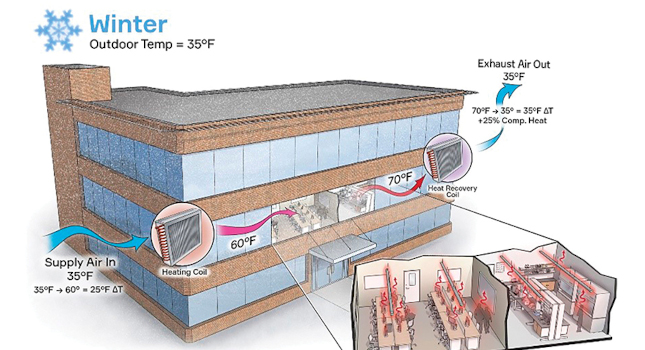 Should the exhaust air energy recovery not meet the full building heating load, the load reduction simplifies the electrification of the remaining heating load. For all electric projects also pursuing the highest energy efficiency, it should be noted that this solution includes fan and pump energy penalties when compared to many other all electric design solutions.