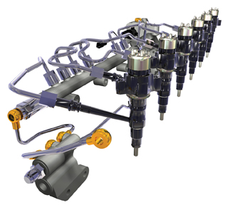 The high-pressure common rail fuel system plays a big role in meeting the new requirements. Increasing fuel pressures, along with the retarding of injection timing, reduces NOx without increasing PM or HC. Alterations to nozzle design and injection systems themselves can have an impact as well. For example, multiple injection events per cycle improve fuel atomization and penetration of the combustion chamber, boosting fuel efficiency while reducing PM.