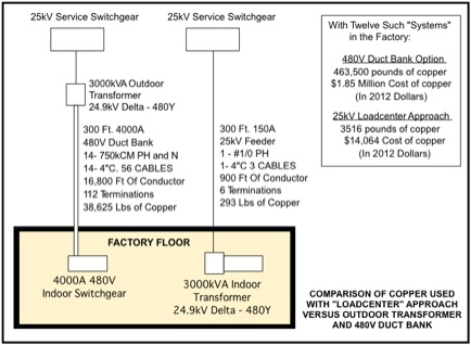 The basic concept was that if you could take medium voltage distribution at 5, 15, or 25 kV, and run it long distances deep inside a big factory over very small conductors, then connect it to step-down transformers located “in the center” of the actual heavy loads, then the very large cross-section low voltage secondary feeder cables could be greatly reduced in length.